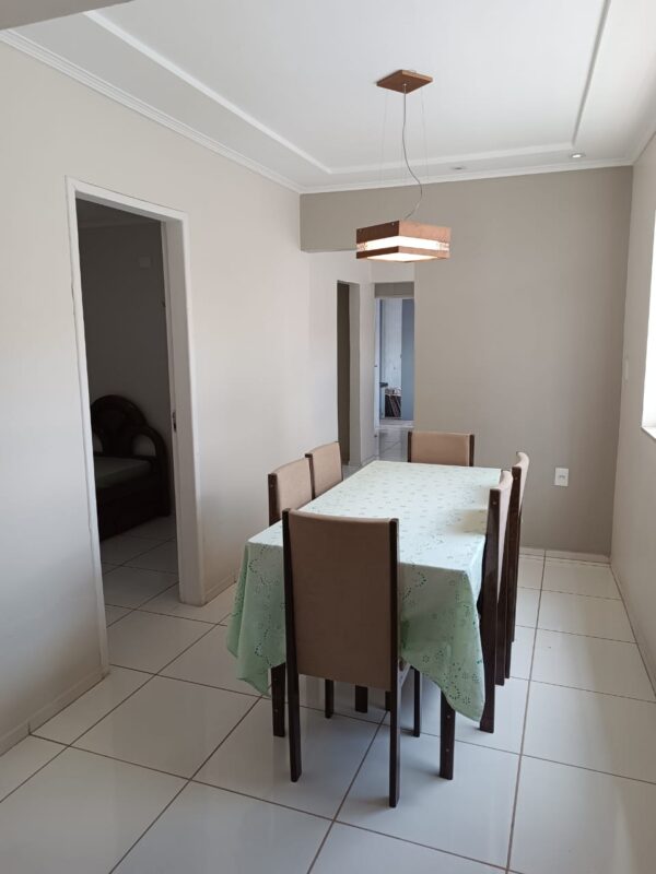 02 quartos; 01 banheiro social; 01 sala para dois ambientes; 01 cozinha; 01 área de serviço; 01 varanda.