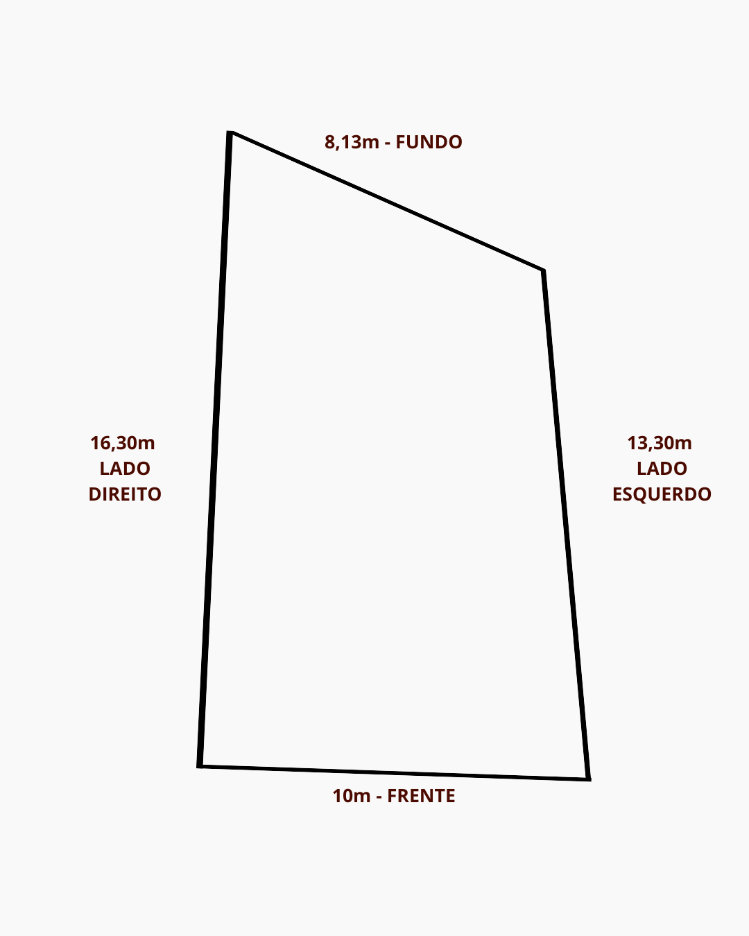Frente: 10,00 m – Fundos: 8,13 m – Lado direito: 16,30 m – Lado esquerdo: 13,30 m. Ao lado das Lojas Americanas.
